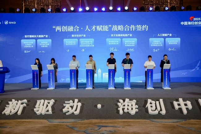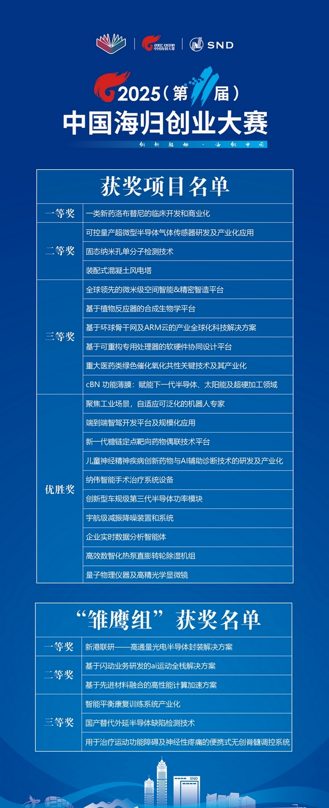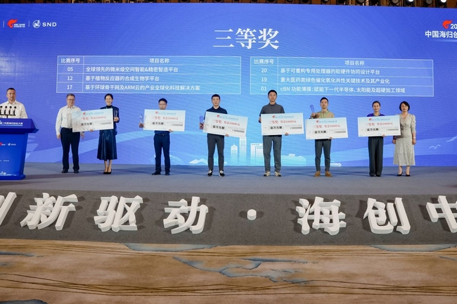 在頒獎儀式中,科技部、工信部、致公黨中央等大賽指導單位以及江蘇省、蘇州市有關部門領導為獲獎項目頒發(fā)了獎杯、獎金和證書。現場還作了中國海歸創(chuàng)業(yè)大賽10周年總結,全面回顧了大賽舉辦10屆以來所重點開展的工作和取得的成果;發(fā)布了中國海歸創(chuàng)業(yè)大賽10周年TOP100優(yōu)秀企業(yè)榜單,根據歷屆參賽企業(yè)近年來在企業(yè)成長性、科技創(chuàng)新力、行業(yè)影響力、地區(qū)貢獻度等方面進行綜合評定,有海柔創(chuàng)新、青禾晶元、杉數科技、斯乾智駕、漢陽科技、識光芯科、景略半導體、圣德醫(yī)療、英磁新能源等100家優(yōu)秀企業(yè)入選。此外,活動還為在大賽組織服務中作出重要貢獻、給予推動支持的一批單位頒發(fā)了中國海歸創(chuàng)業(yè)大賽10周年特別貢獻獎和組織貢獻獎,并舉行了中國海歸創(chuàng)業(yè)大賽成果轉化基地啟動儀式及項目簽約儀式。