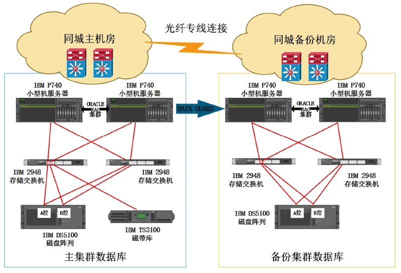 如圖所示,生產(chǎn)中心和災備中心之間各自采用2臺性能強勁的IBM P740小型機服務器和IBM DS5100存儲陣列搭建獨立的ORACLE 11G RAC集群。生產(chǎn)中心和災備中心間租用運營商專用光纖線路傳輸數(shù)據(jù)。利用ORACLE DATAGUARD技術(shù),生產(chǎn)中心和災備中心的ORACLE RAC集群異步復制數(shù)據(jù)。同時災備中心的ORACLE RAC集群將為客戶其他分支業(yè)務提供查詢支持,充分分擔生產(chǎn)中心ORACLE RAC集群的負載,兼顧了性能和成本的平衡。生產(chǎn)中心配置IBM TS3100磁帶庫,配合IBM TSM備份軟件調(diào)度,每晚備份數(shù)據(jù),同時建立每周定期磁帶離線、異地保存制度,實現(xiàn)同城容災負載分擔、異地離線備份的架構(gòu),既提高了核心數(shù)據(jù)庫集群性能,又為數(shù)據(jù)安全提供了充分保障。