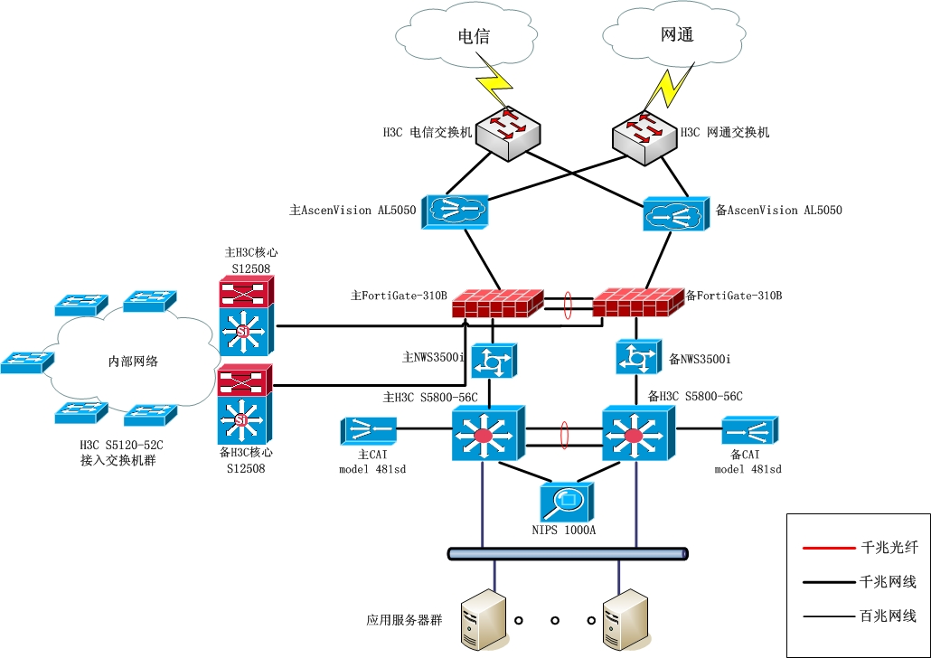 該客戶選擇了我司的解決方案來構筑。企業網核心采用兩臺H3C S12508萬兆核心路由交換機互相備份和冗余;終端接入采用多臺H3C S5120-52C交換機;服務器區域采用H3C S5800-56C交換機接入,配合CAI 481SD服務器負載均衡分導流量;趨勢NWS3500I防毒墻、綠盟 NIPS 1000A入侵防御保證服務器安全;FORTIGATE 310B防火墻保護出口邊界安全,外網ISP線路由AscenVision AL5050實現鏈路負載均衡。